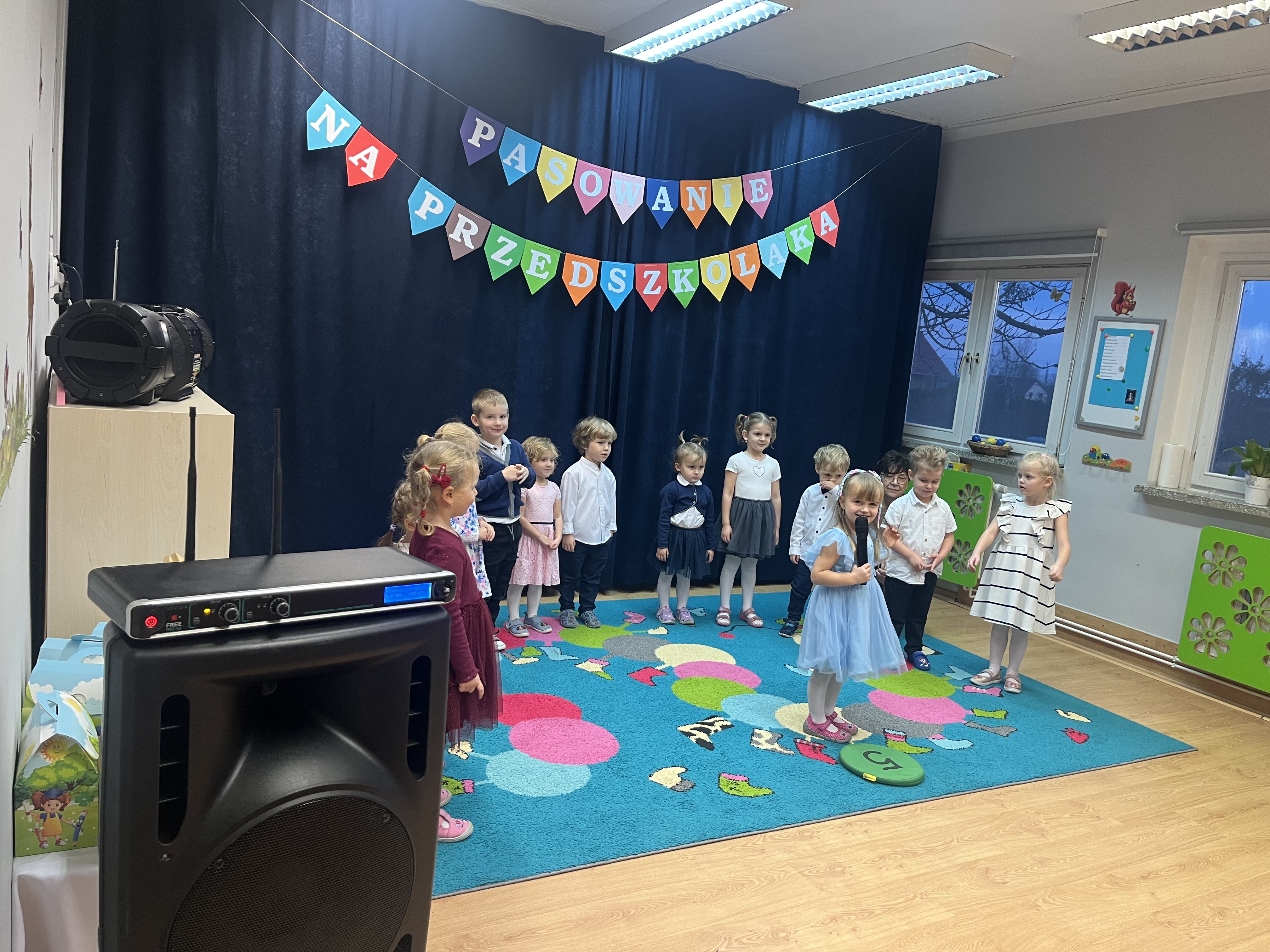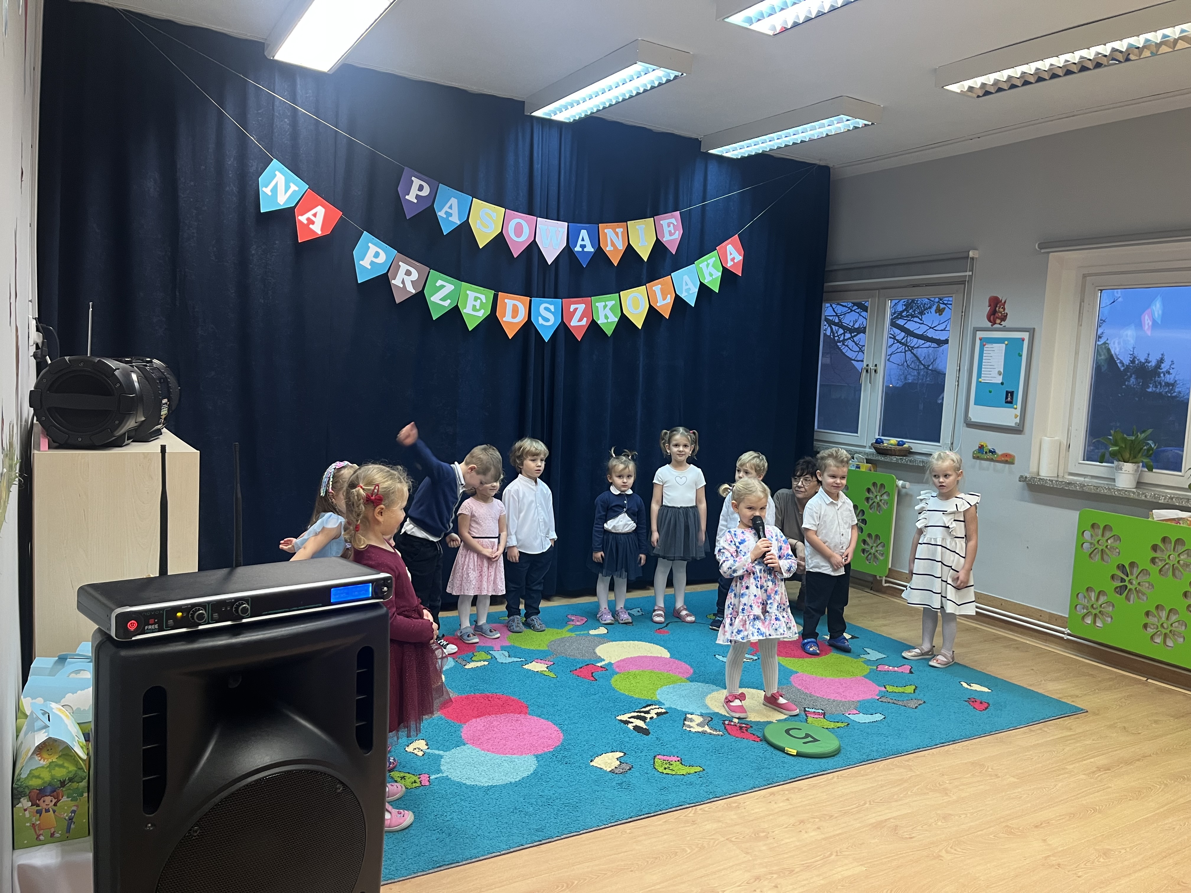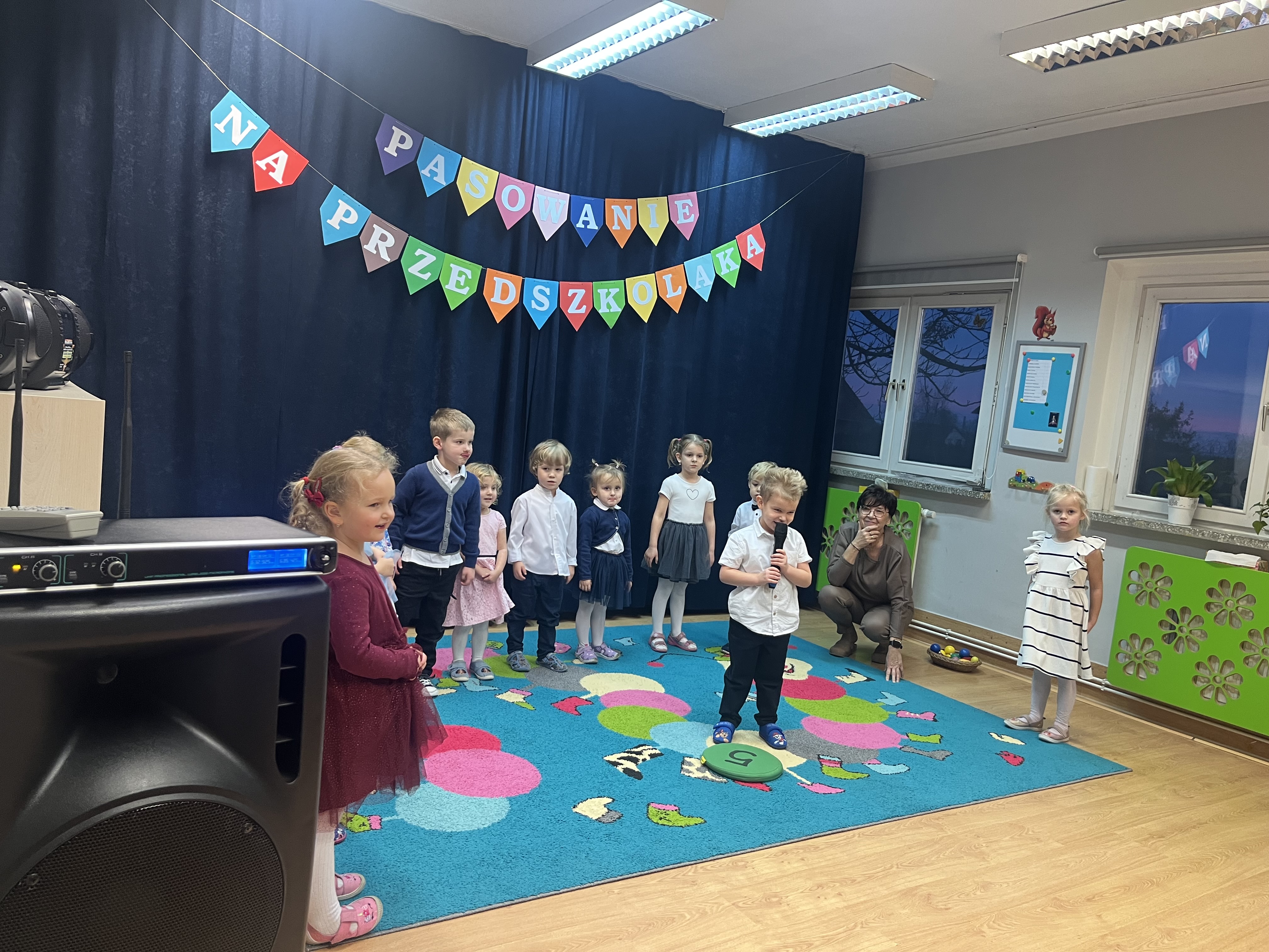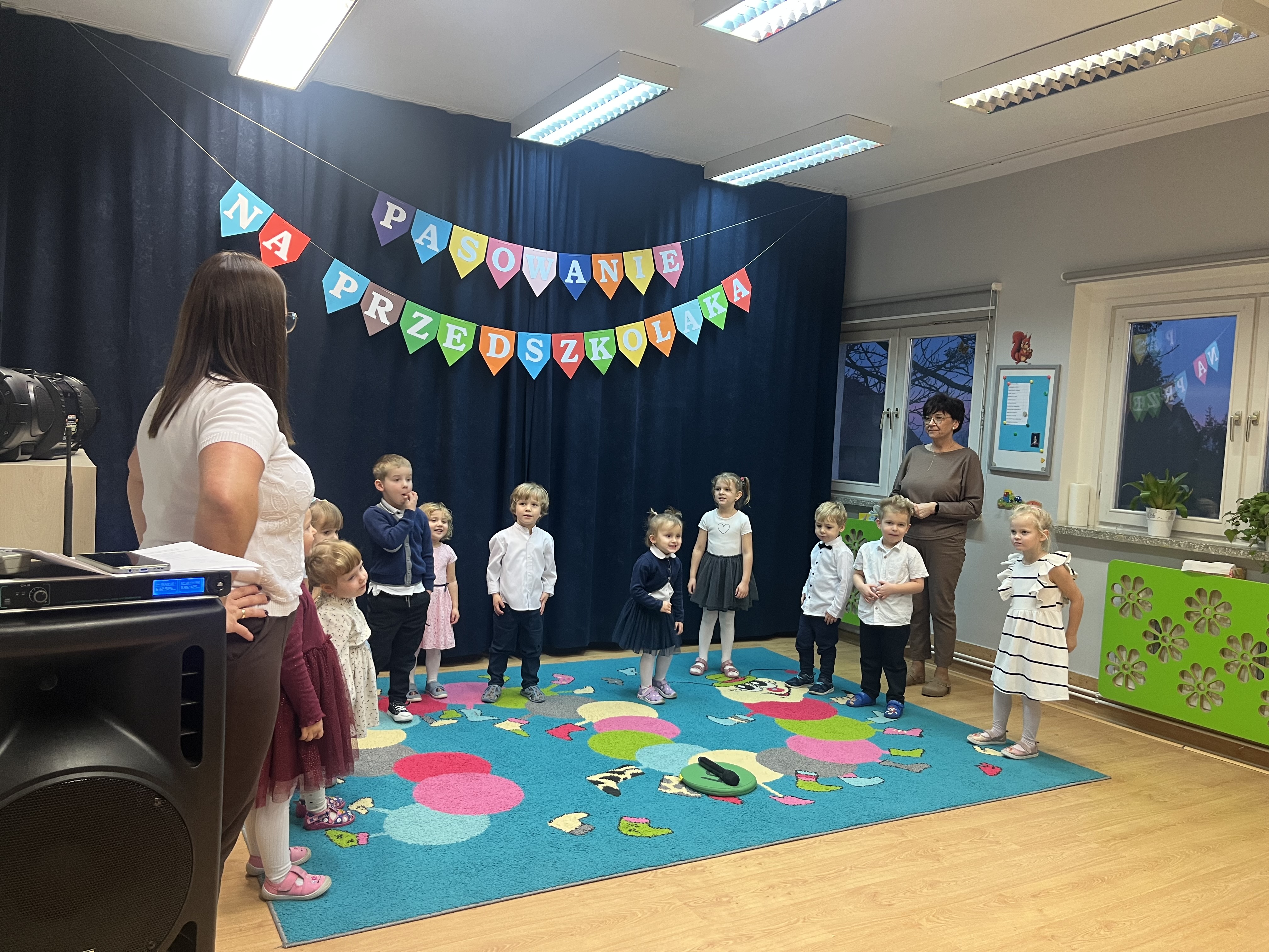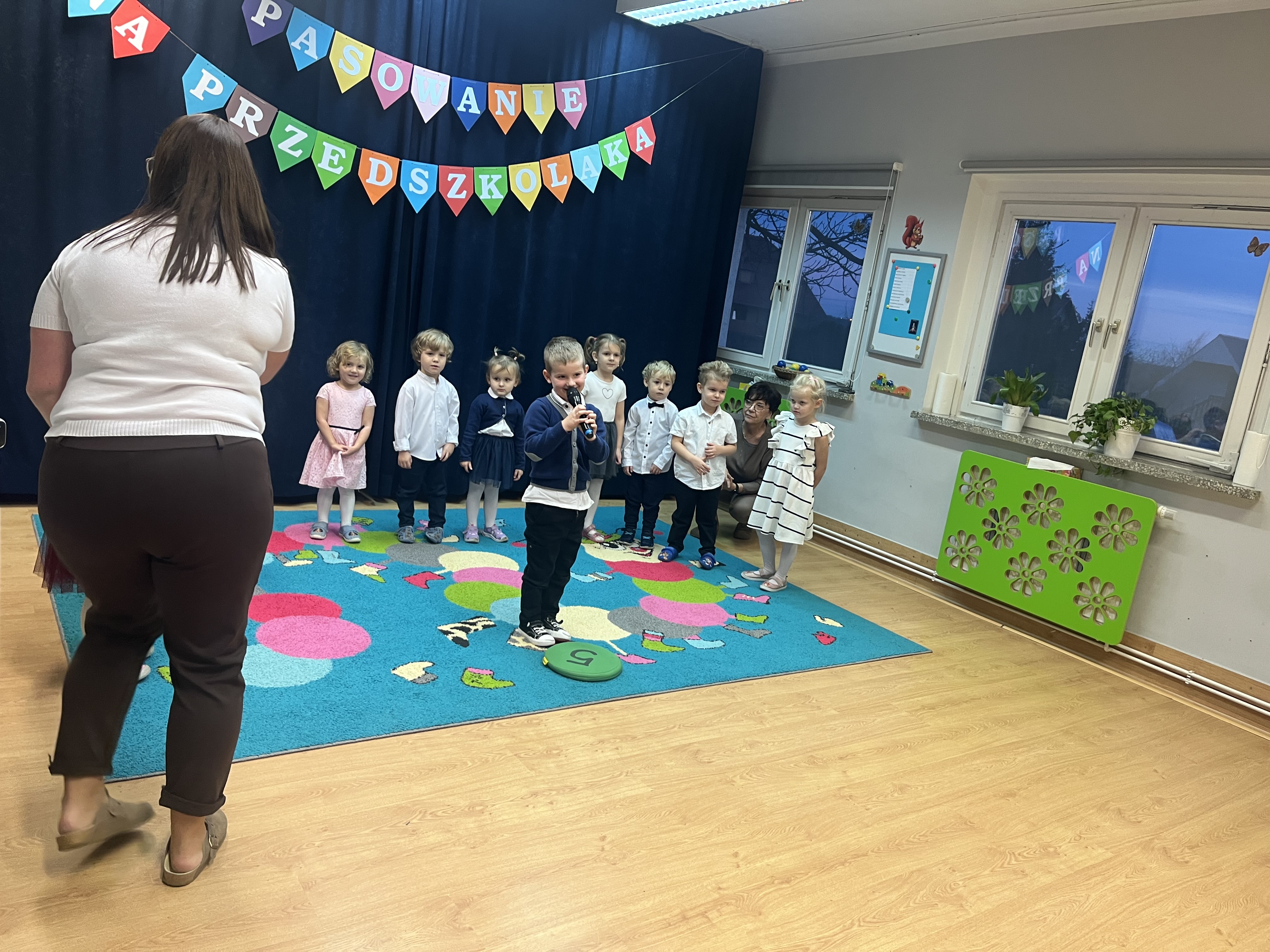 Po występach nastąpił najważniejszy moment – pasowanie na przedszkolaka. Każde dziecko podchodziło do dyrektora, który symbolicznym ołówkiem „dotykał” ich ramienia, wypowiadając słowa pasowania. Ten akt symbolizował oficjalne przyjęcie maluchów do społeczności przedszkolnej oraz rozpoczęcie ich edukacyjnej przygody.