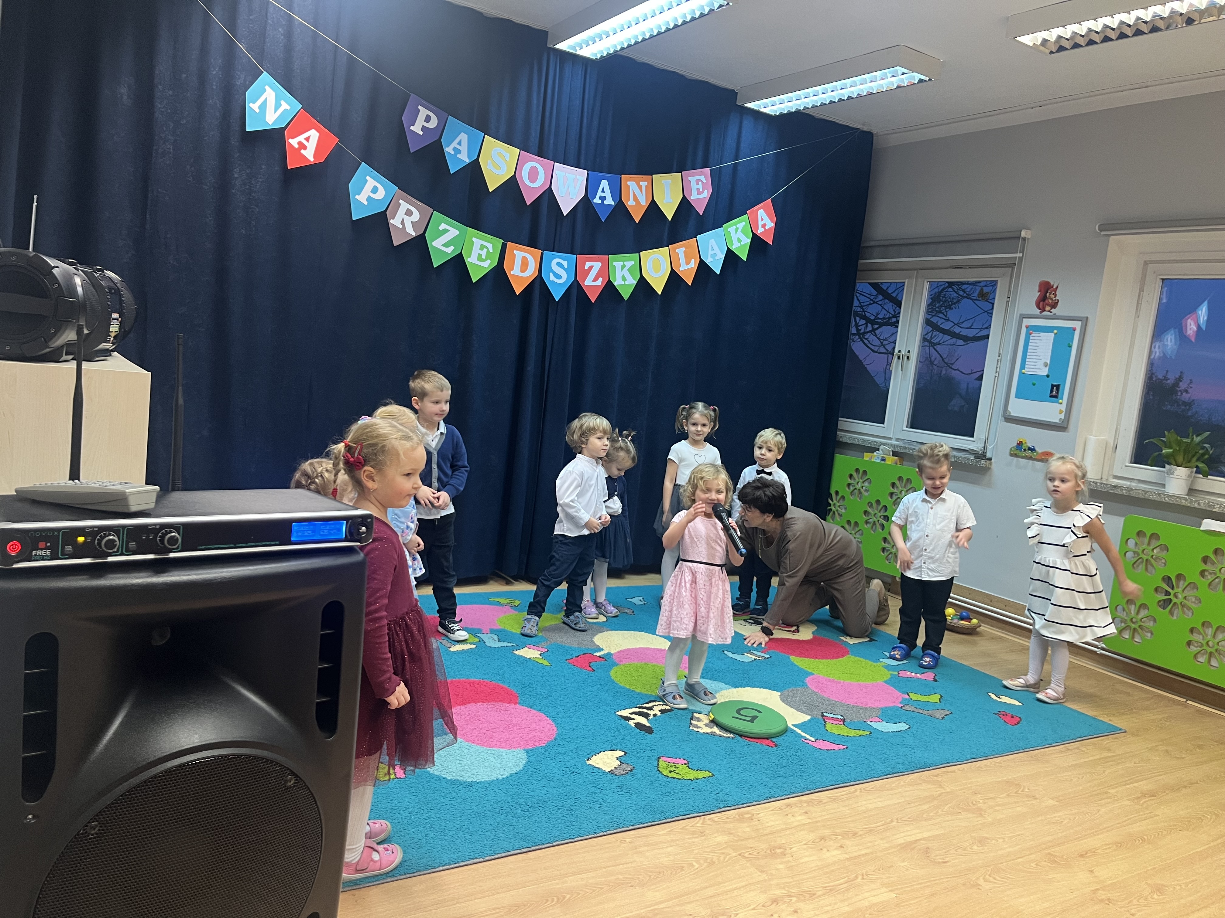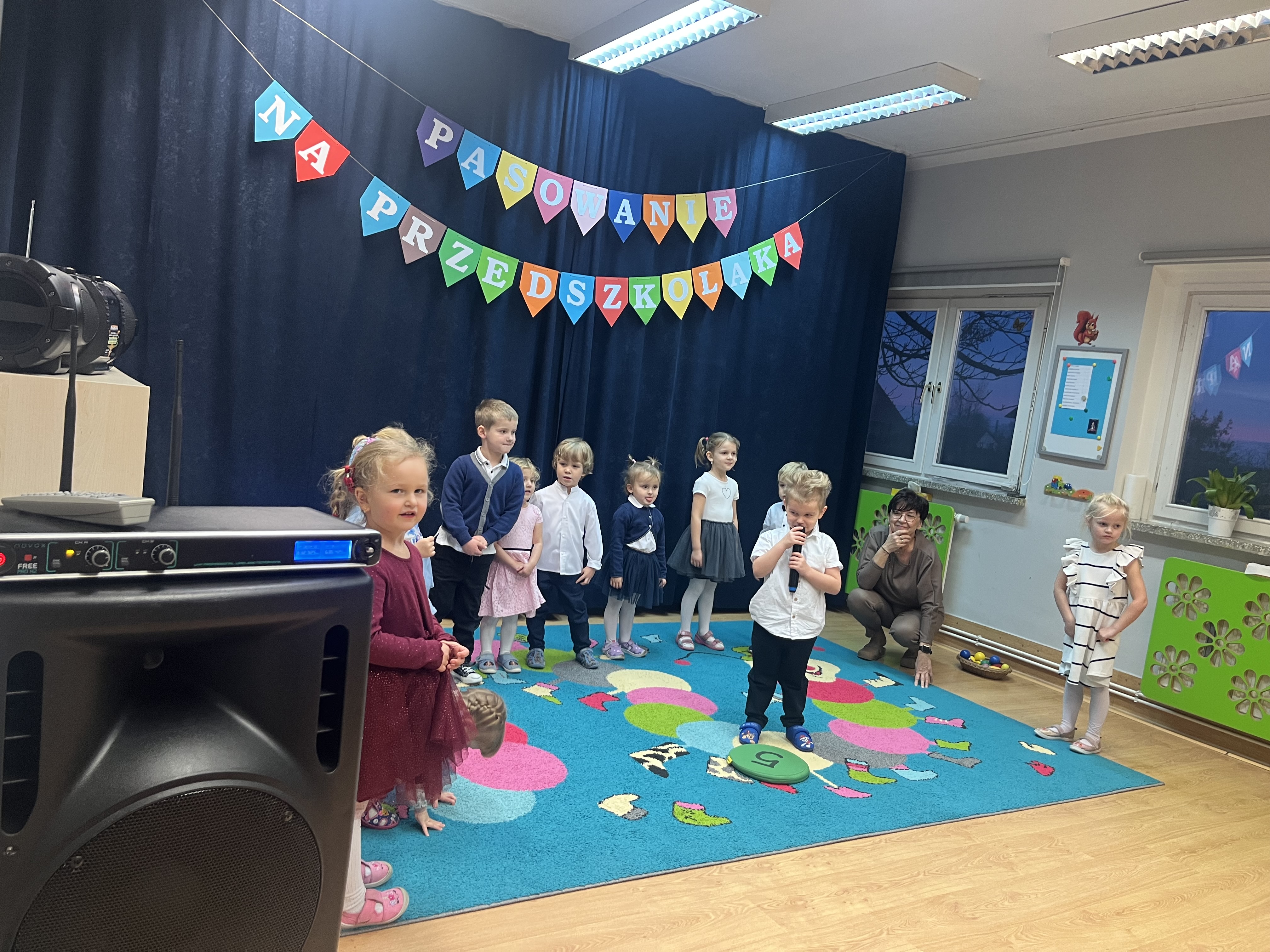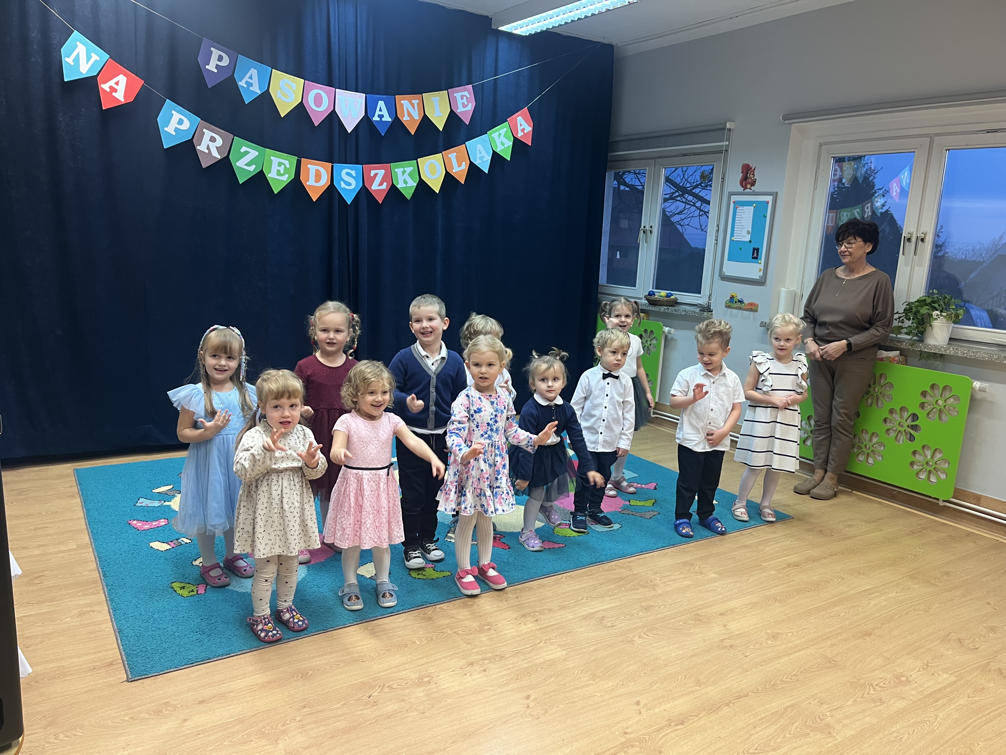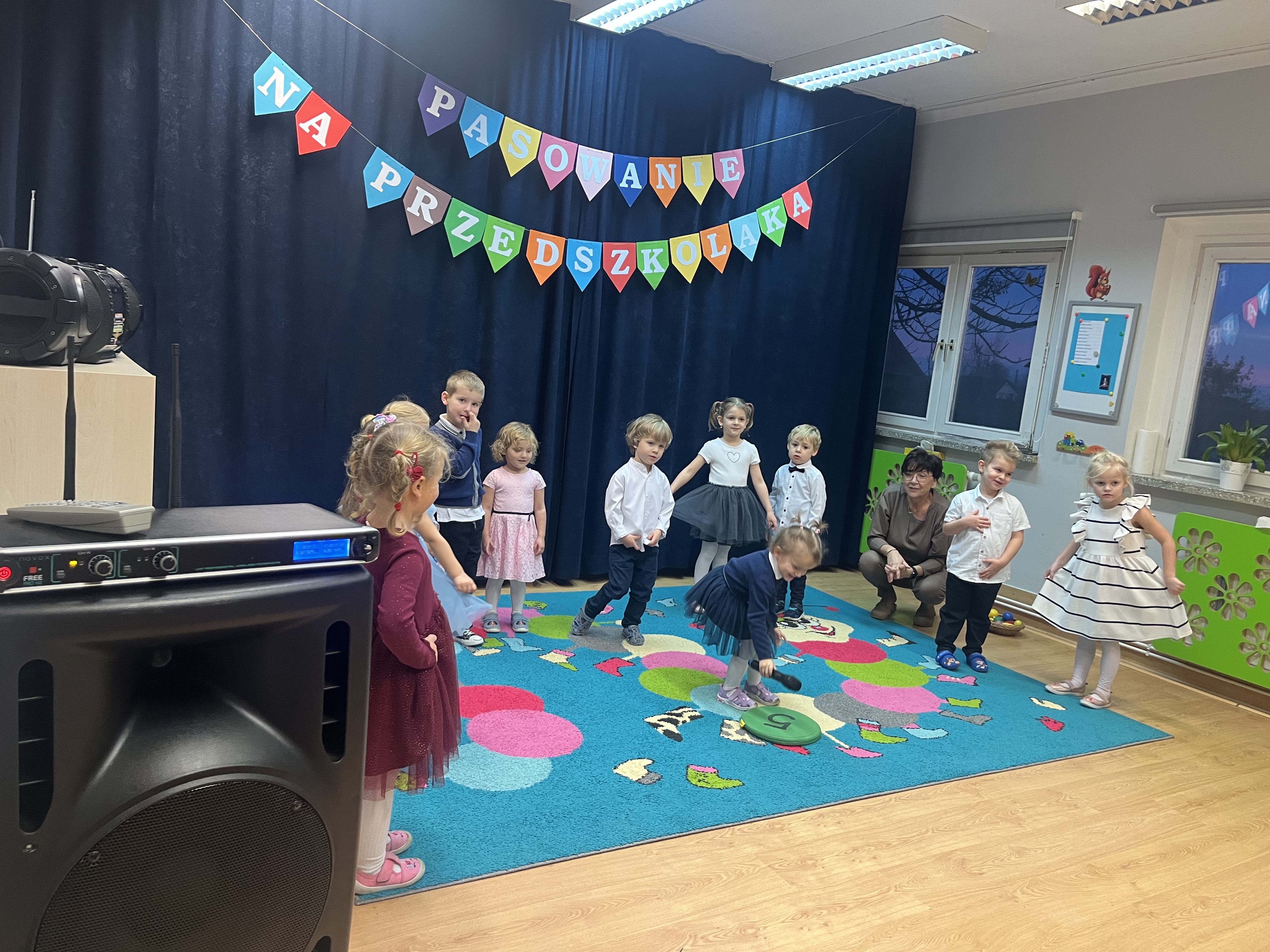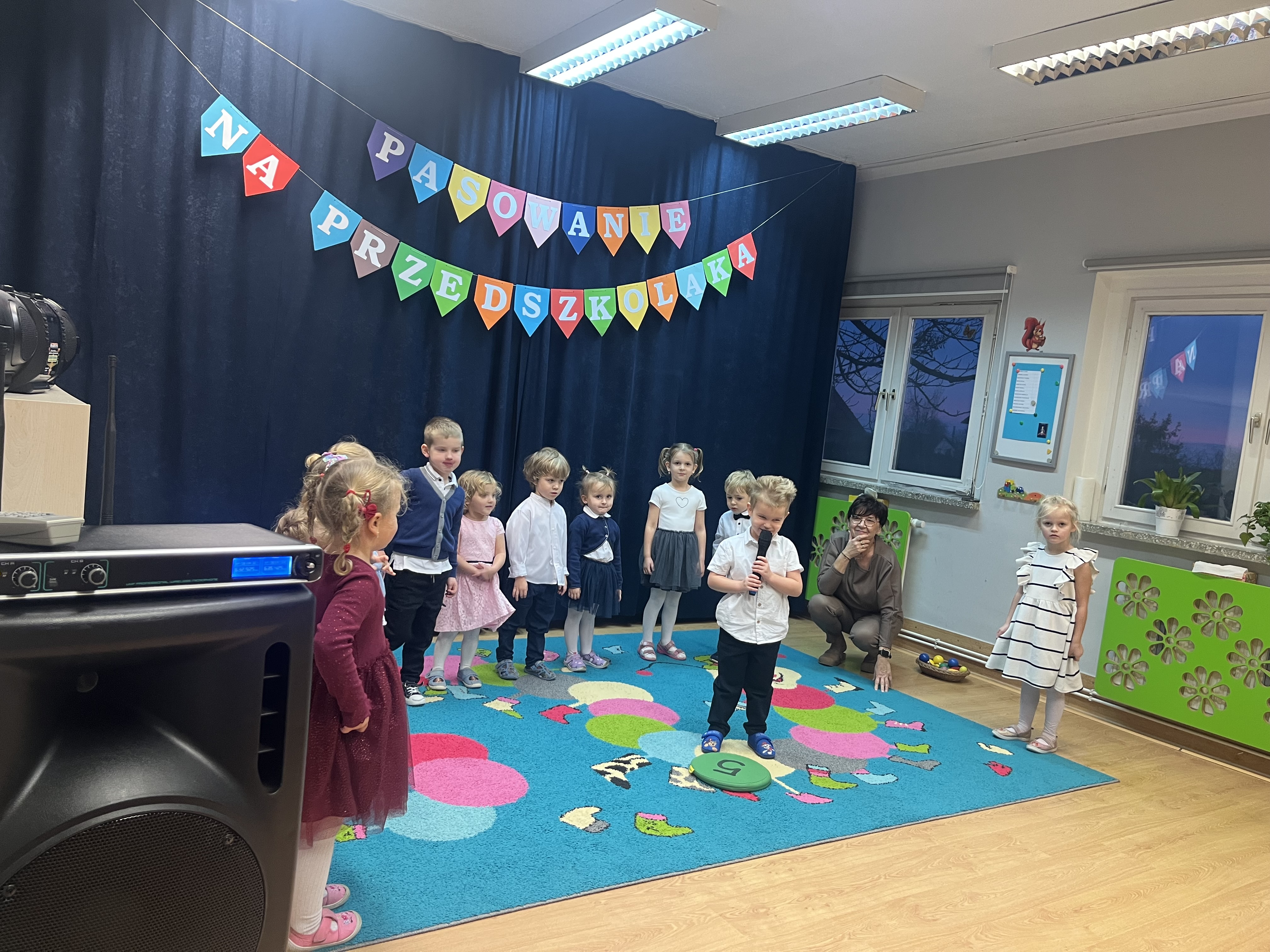 Po występach nastąpił najważniejszy moment – pasowanie na przedszkolaka. Każde dziecko podchodziło do dyrektora, który symbolicznym ołówkiem „dotykał” ich ramienia, wypowiadając słowa pasowania. Ten akt symbolizował oficjalne przyjęcie maluchów do społeczności przedszkolnej oraz rozpoczęcie ich edukacyjnej przygody.