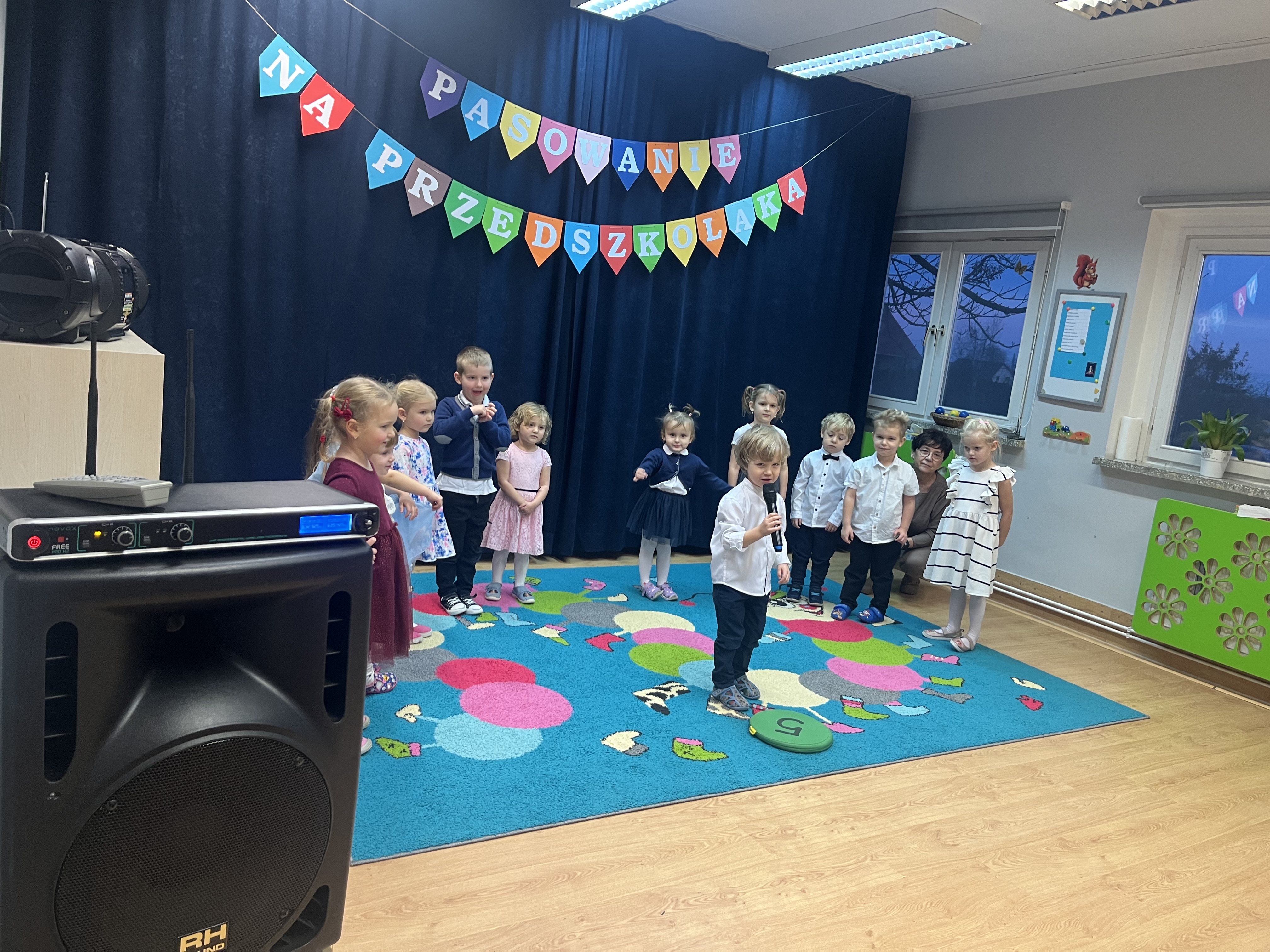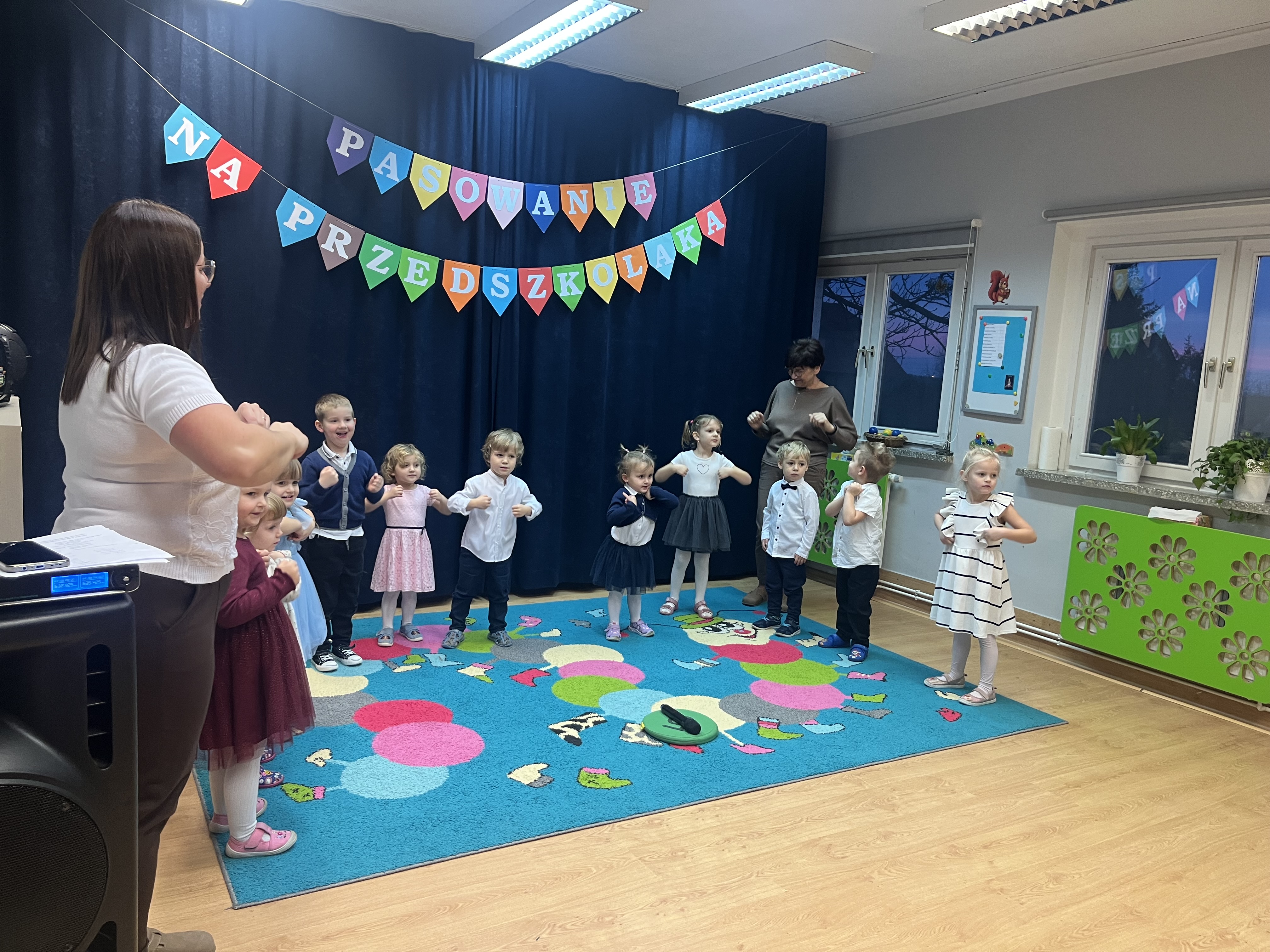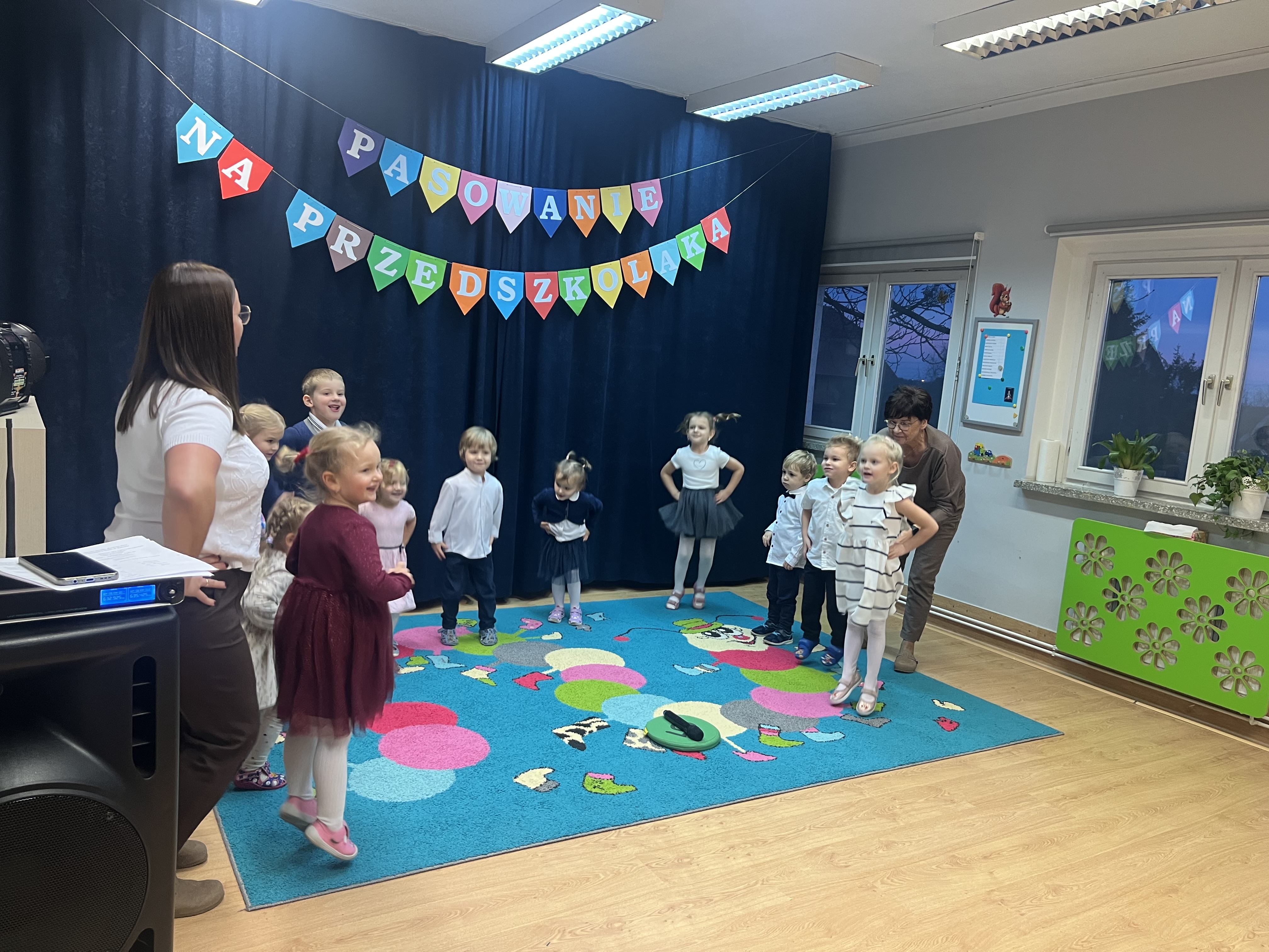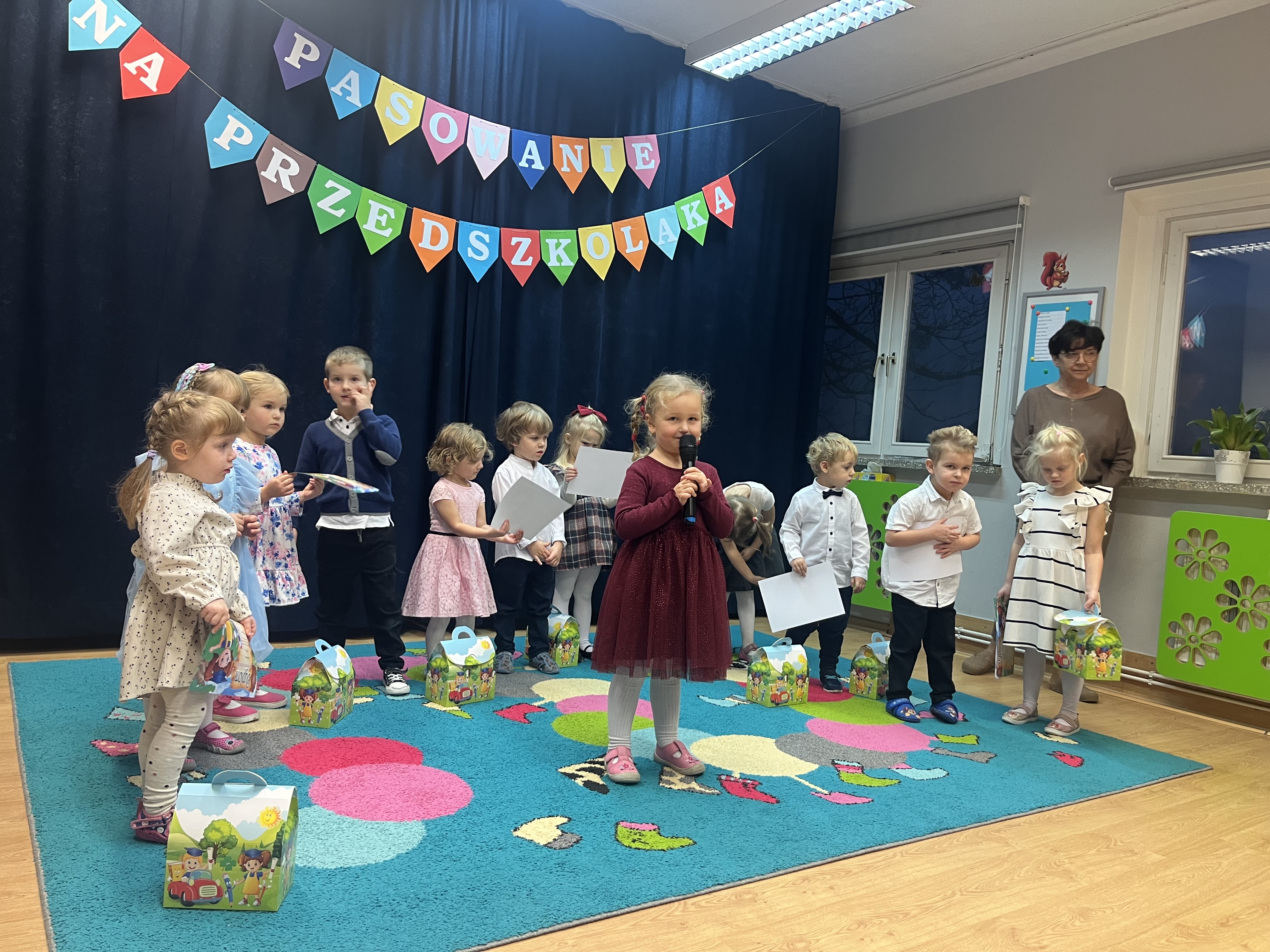 Po występach nastąpił najważniejszy moment – pasowanie na przedszkolaka. Każde dziecko podchodziło do dyrektora, który symbolicznym ołówkiem „dotykał” ich ramienia, wypowiadając słowa pasowania. Ten akt symbolizował oficjalne przyjęcie maluchów do społeczności przedszkolnej oraz rozpoczęcie ich edukacyjnej przygody.