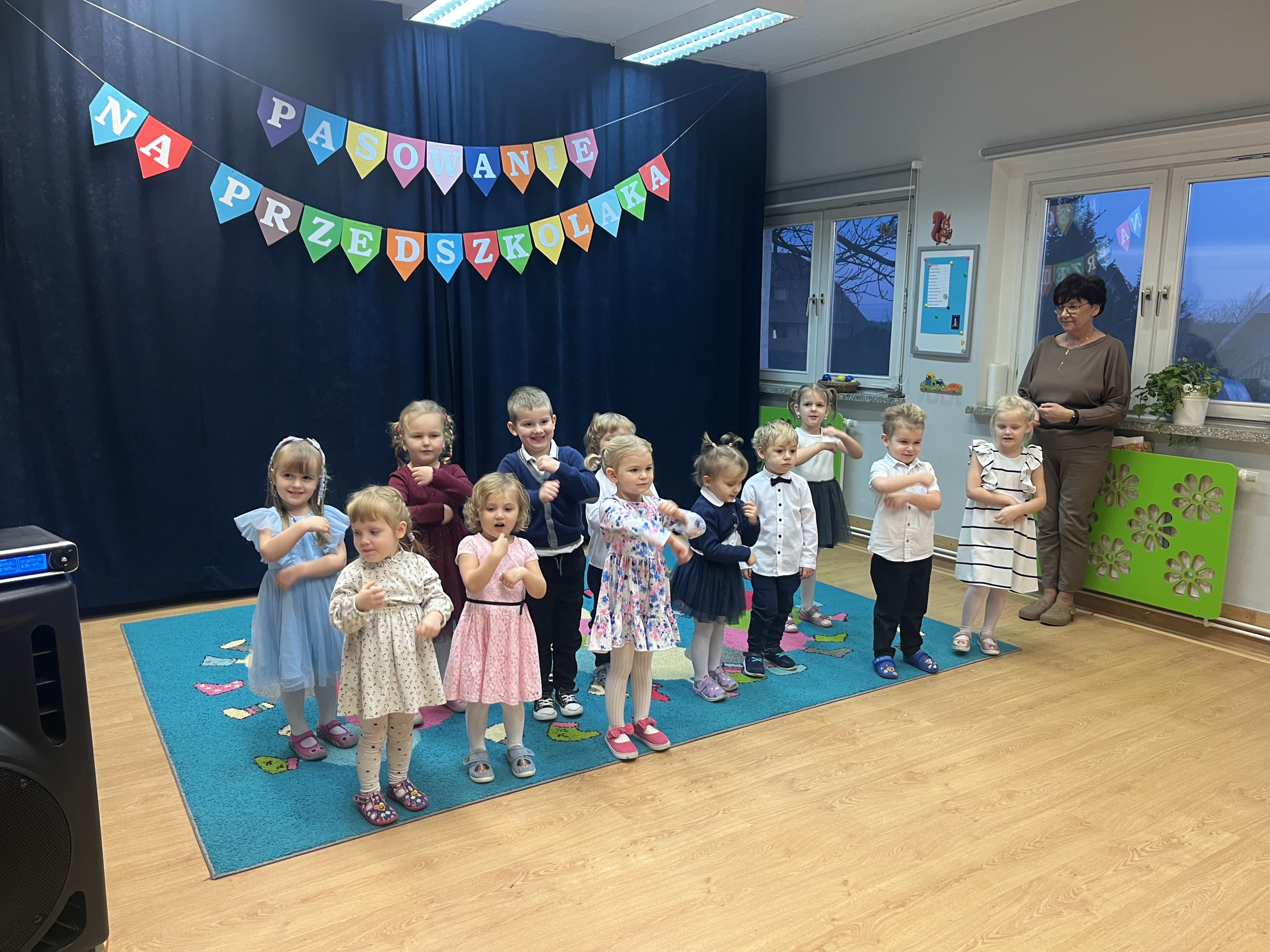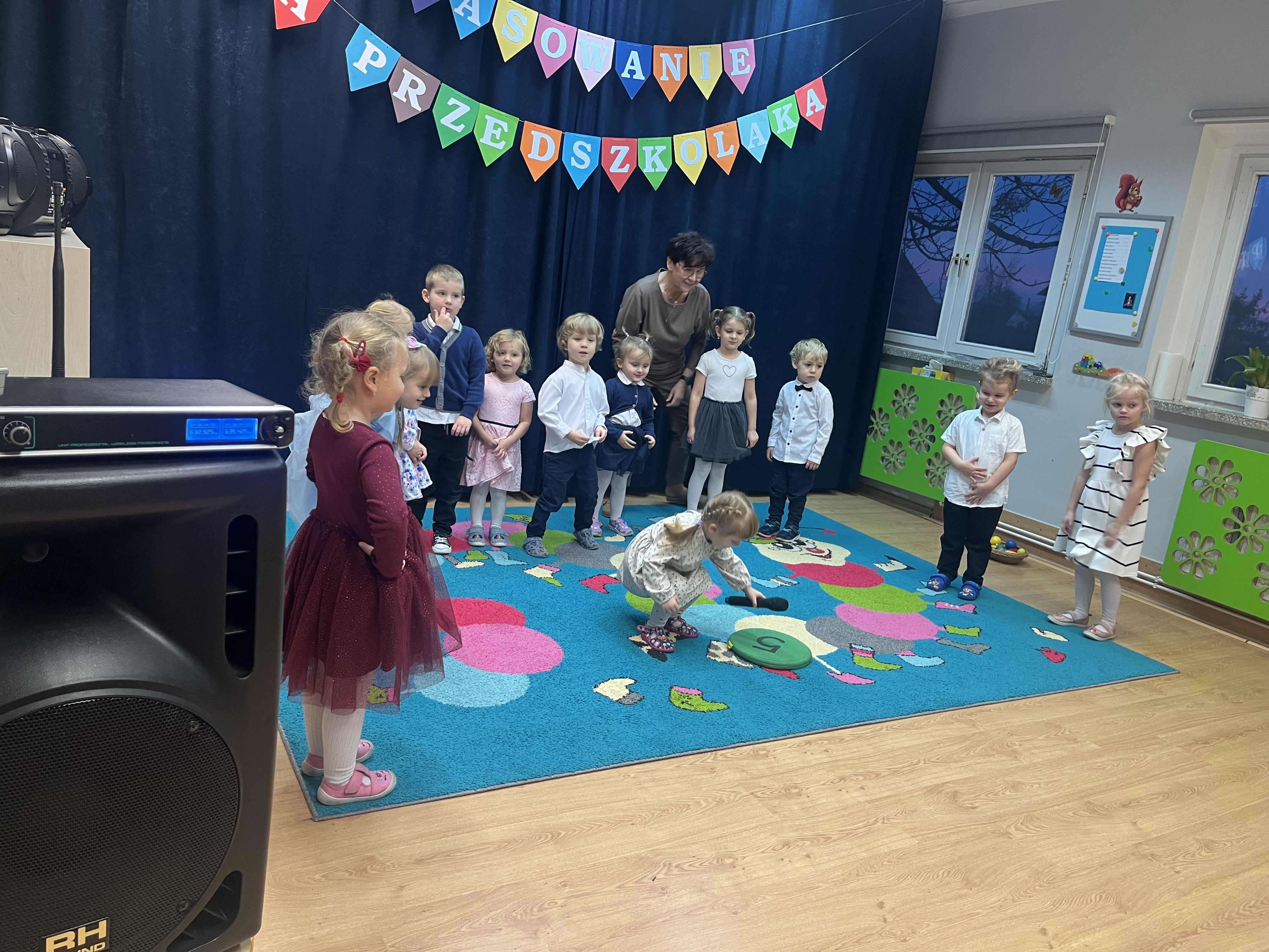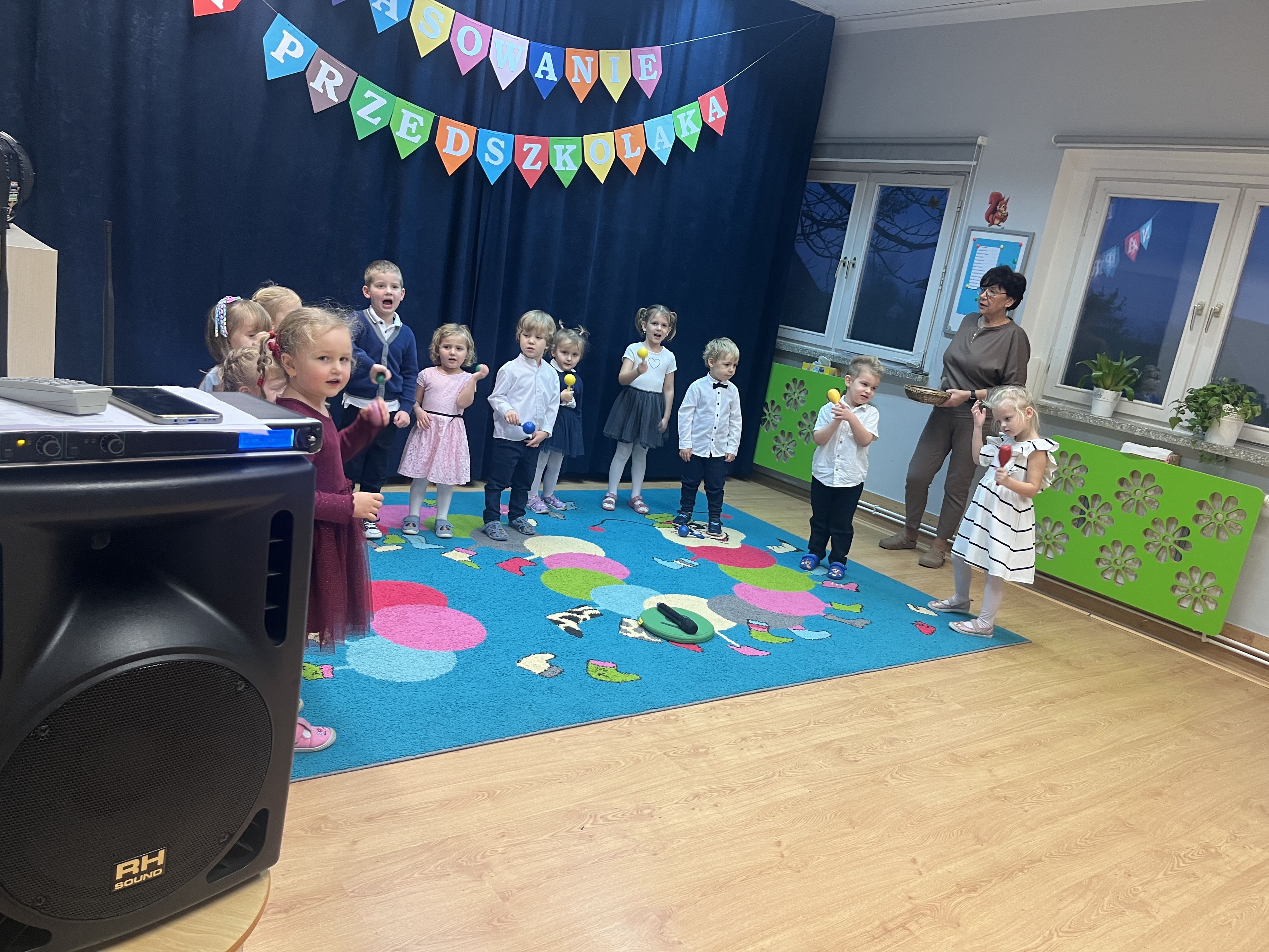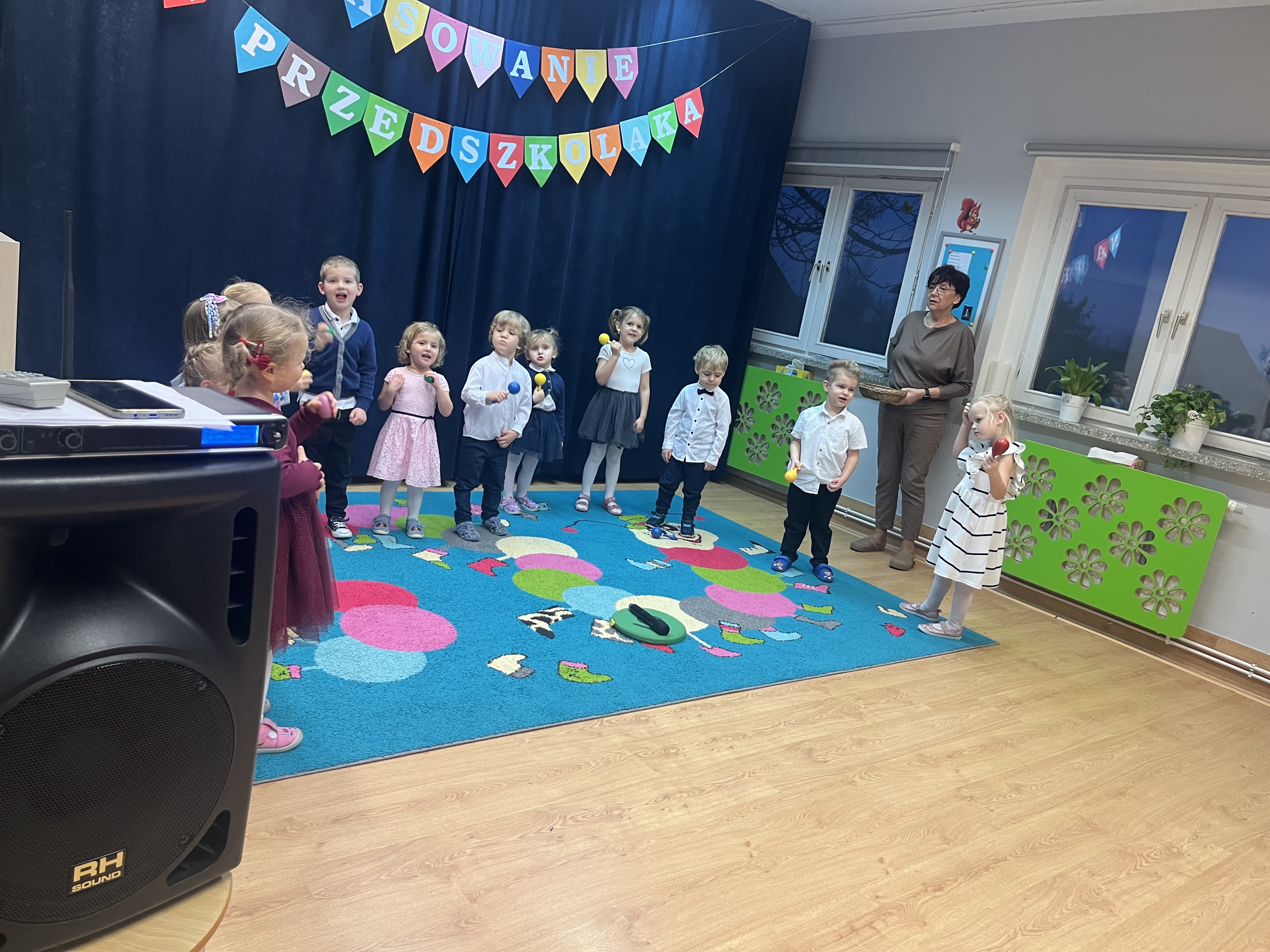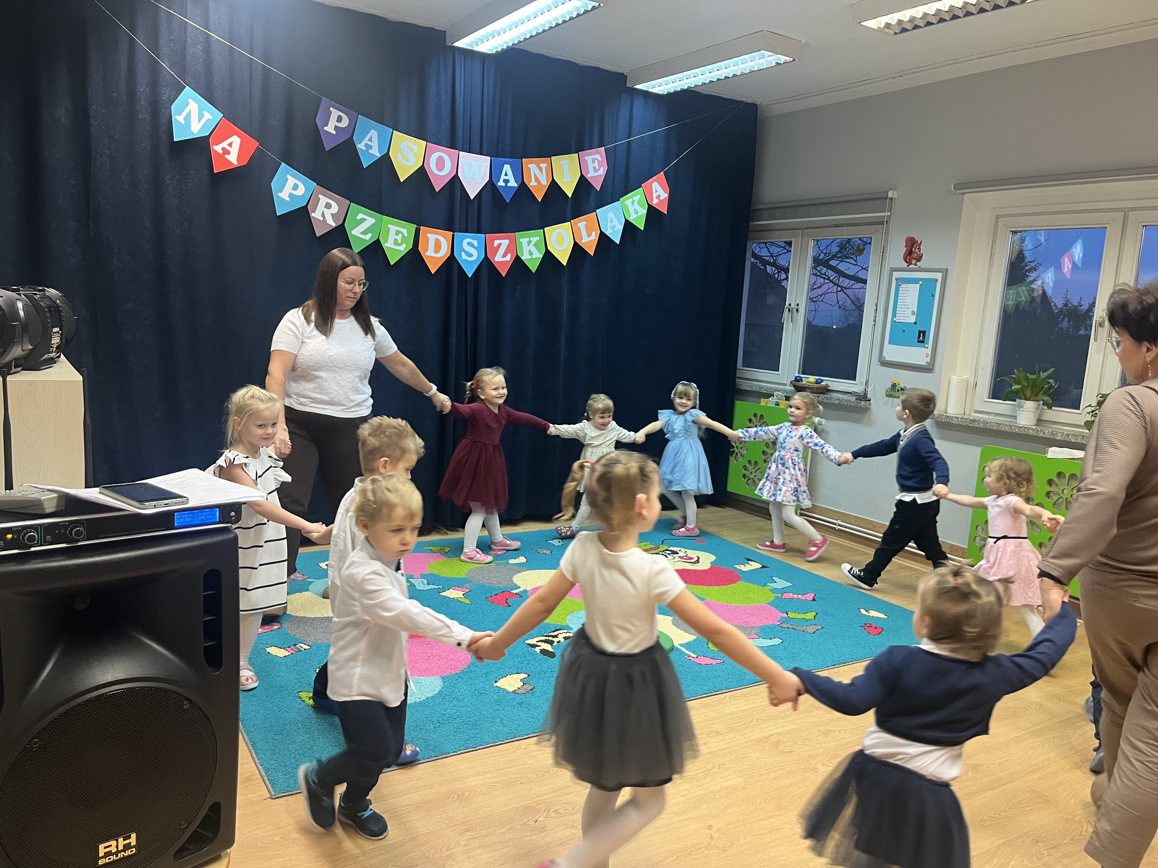 Po występach nastąpił najważniejszy moment – pasowanie na przedszkolaka. Każde dziecko podchodziło do dyrektora, który symbolicznym ołówkiem „dotykał” ich ramienia, wypowiadając słowa pasowania. Ten akt symbolizował oficjalne przyjęcie maluchów do społeczności przedszkolnej oraz rozpoczęcie ich edukacyjnej przygody.