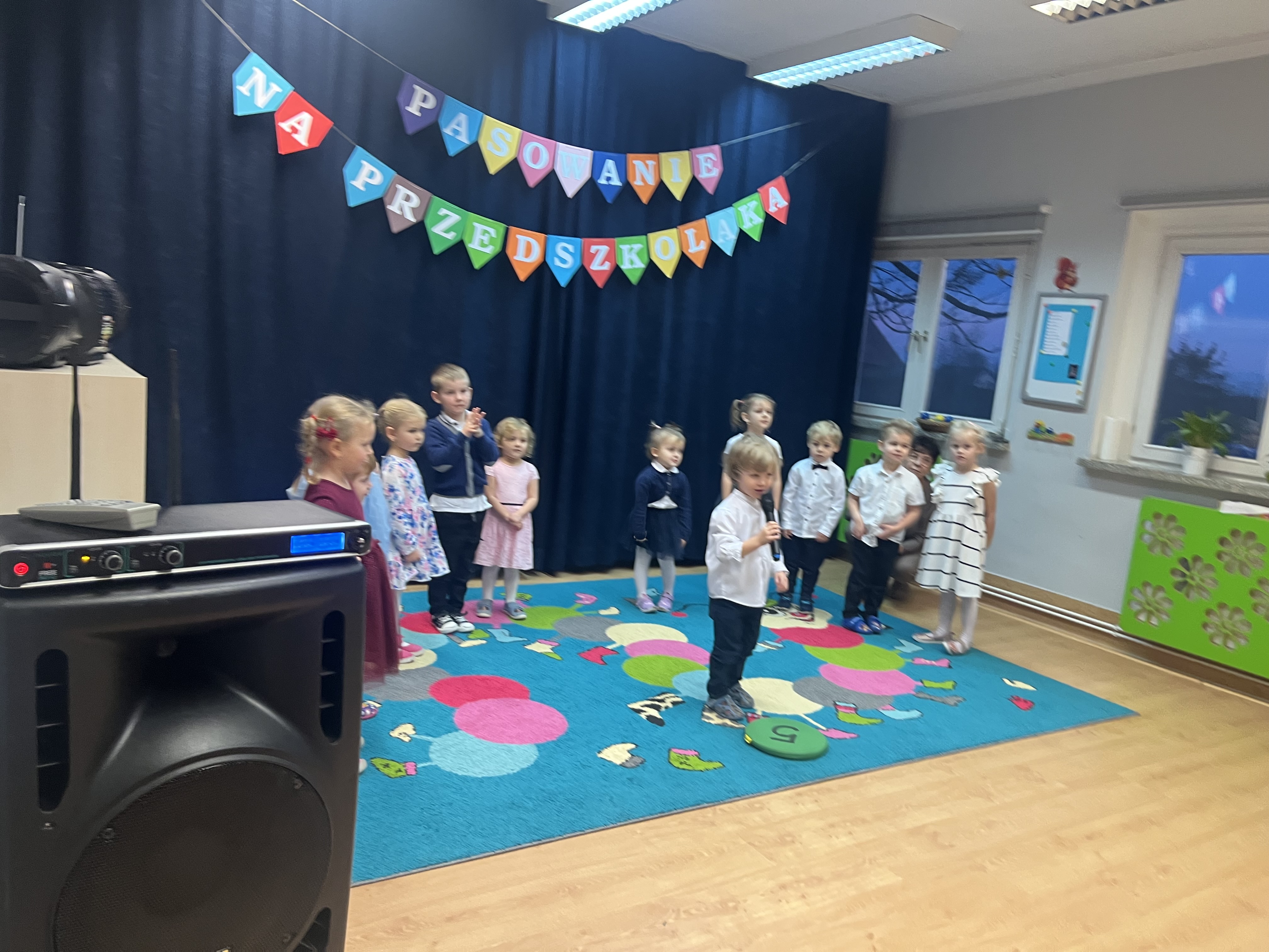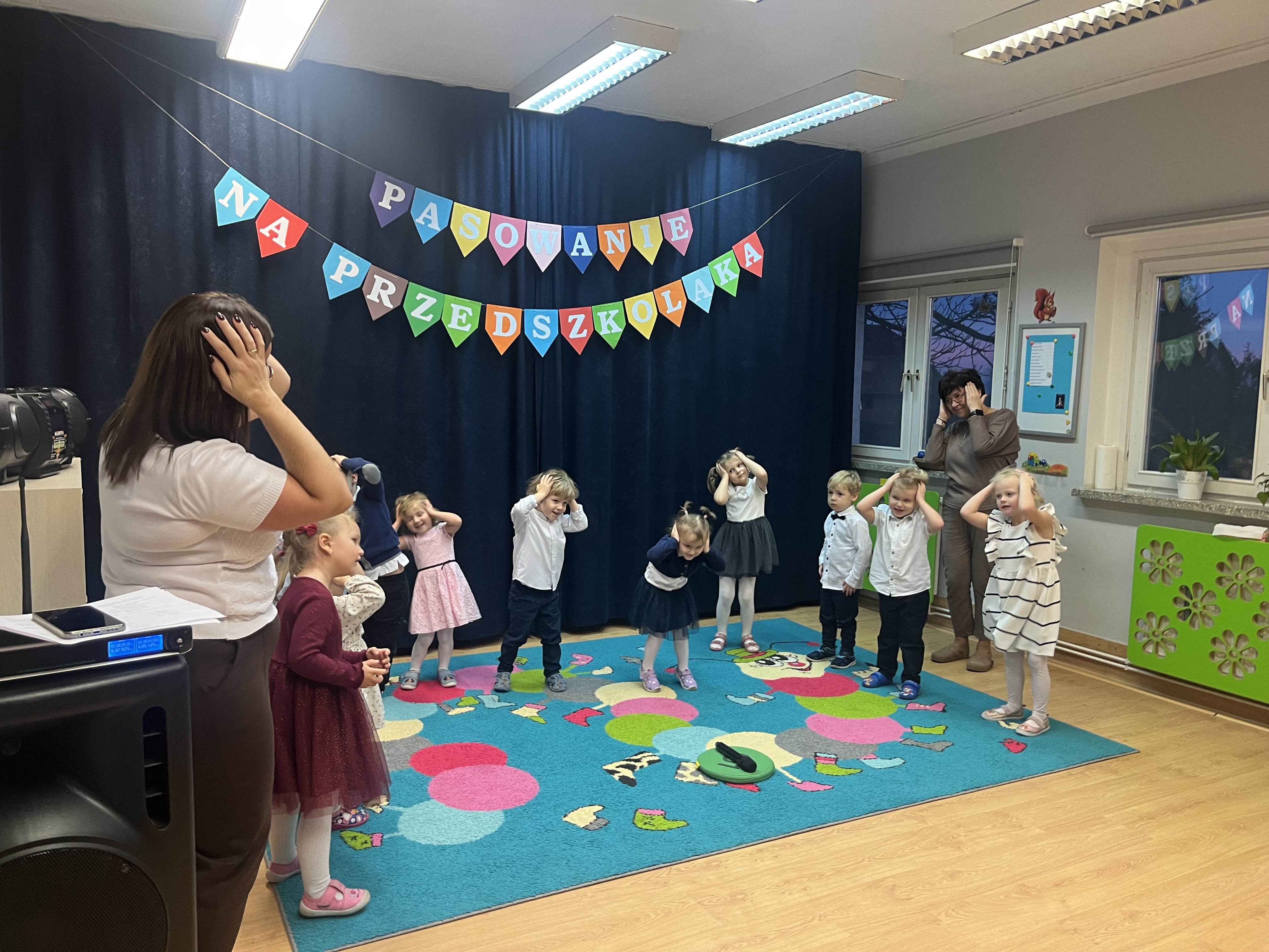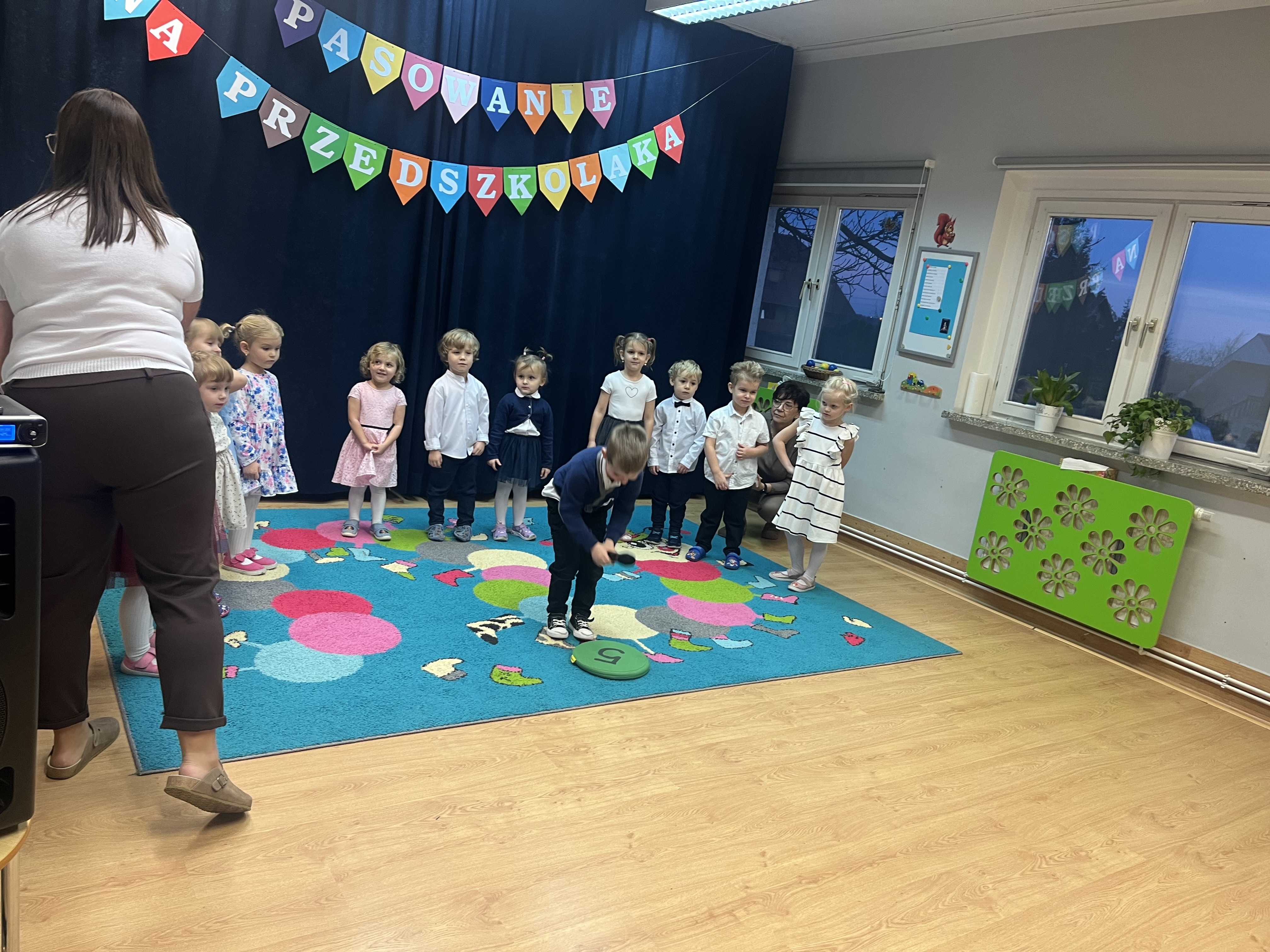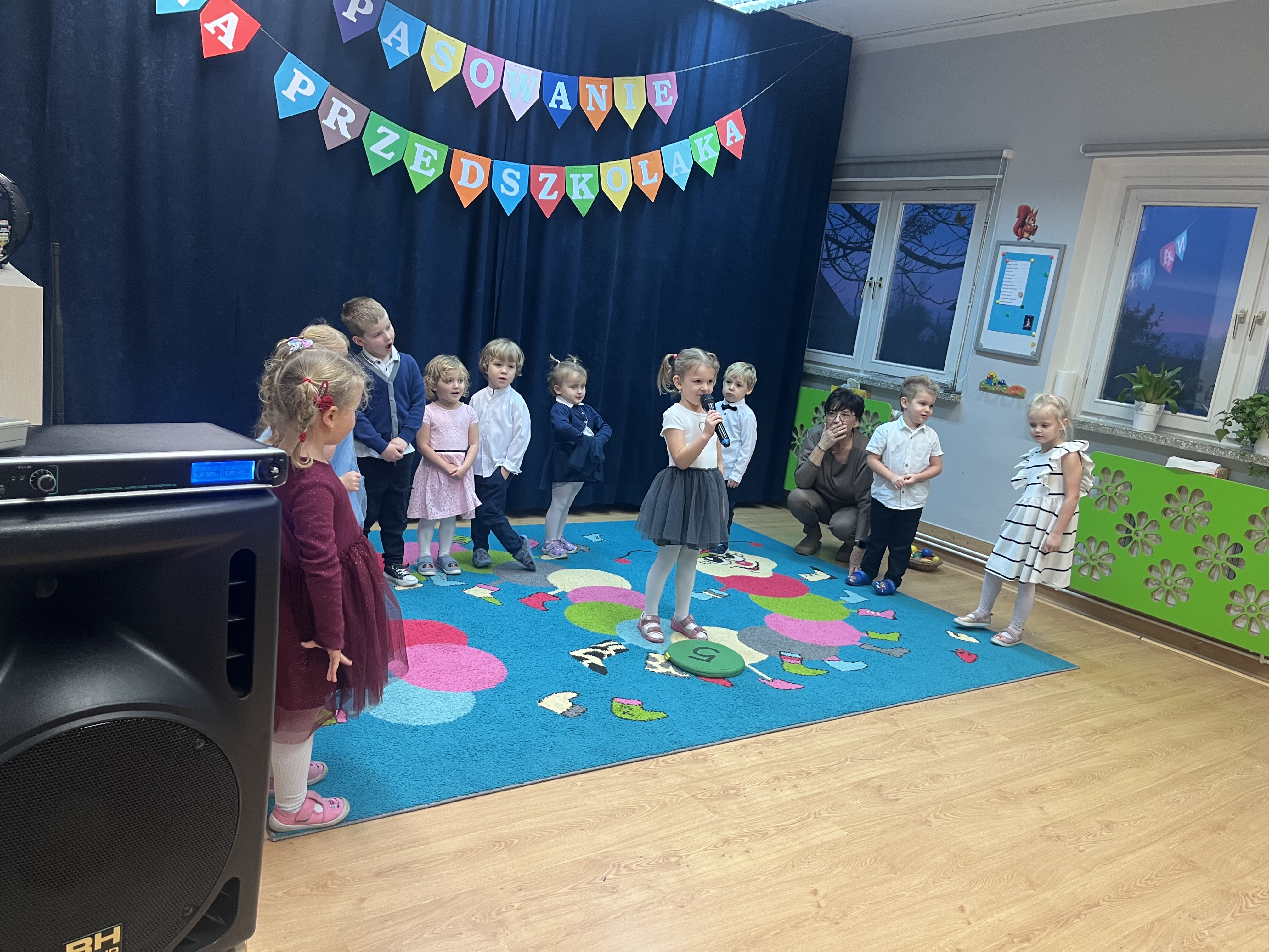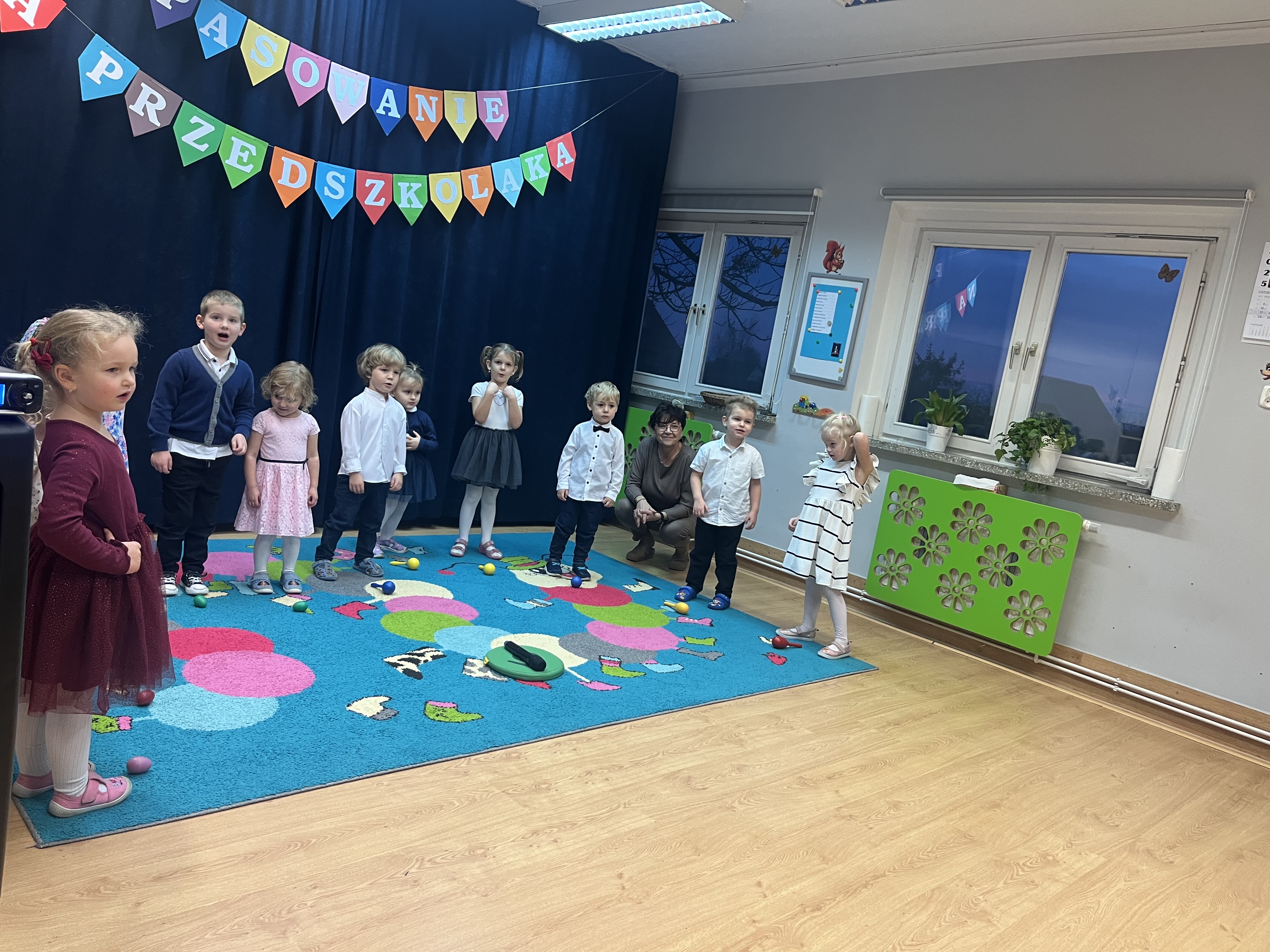 Po występach nastąpił najważniejszy moment – pasowanie na przedszkolaka. Każde dziecko podchodziło do dyrektora, który symbolicznym ołówkiem „dotykał” ich ramienia, wypowiadając słowa pasowania. Ten akt symbolizował oficjalne przyjęcie maluchów do społeczności przedszkolnej oraz rozpoczęcie ich edukacyjnej przygody.