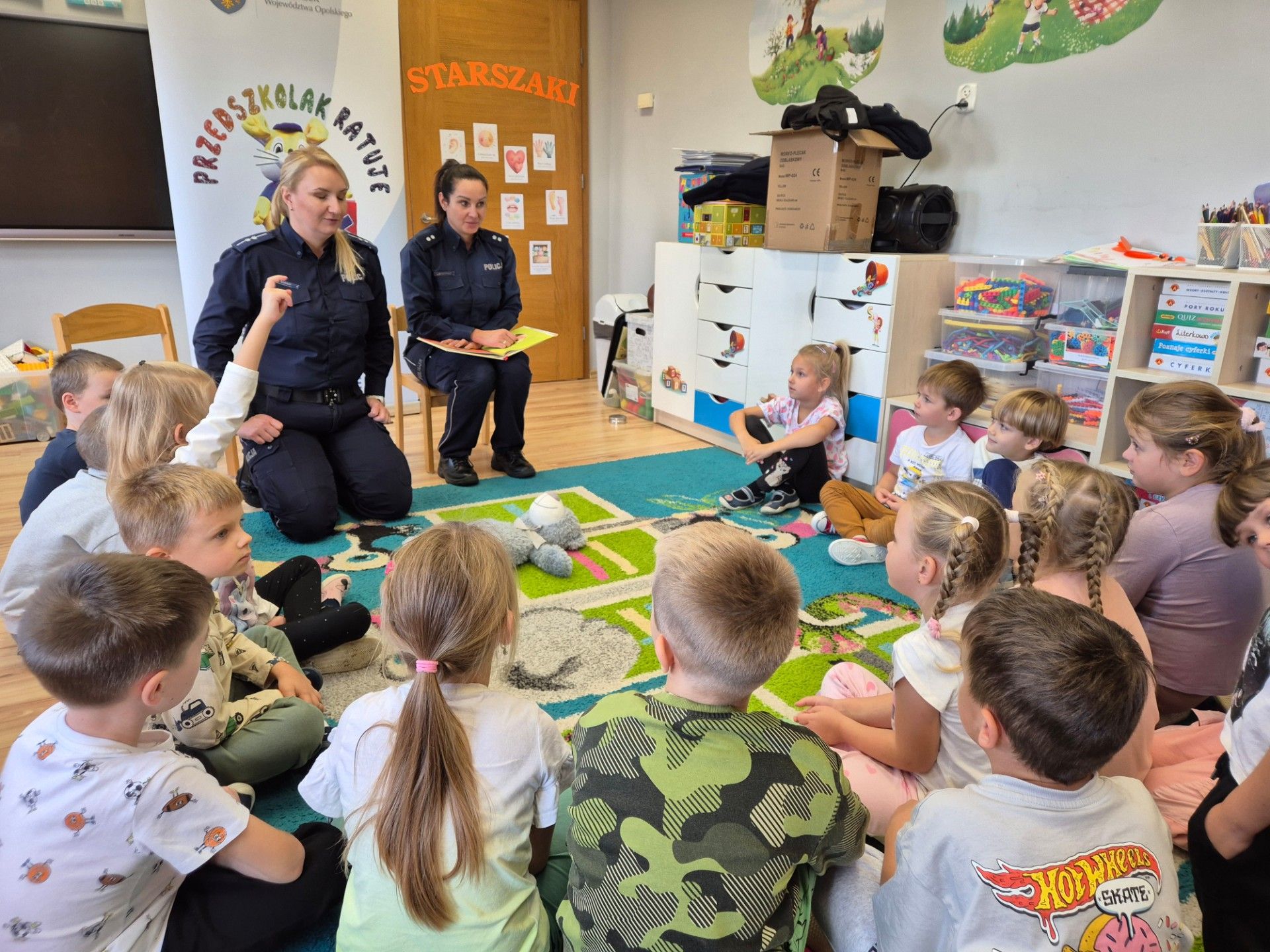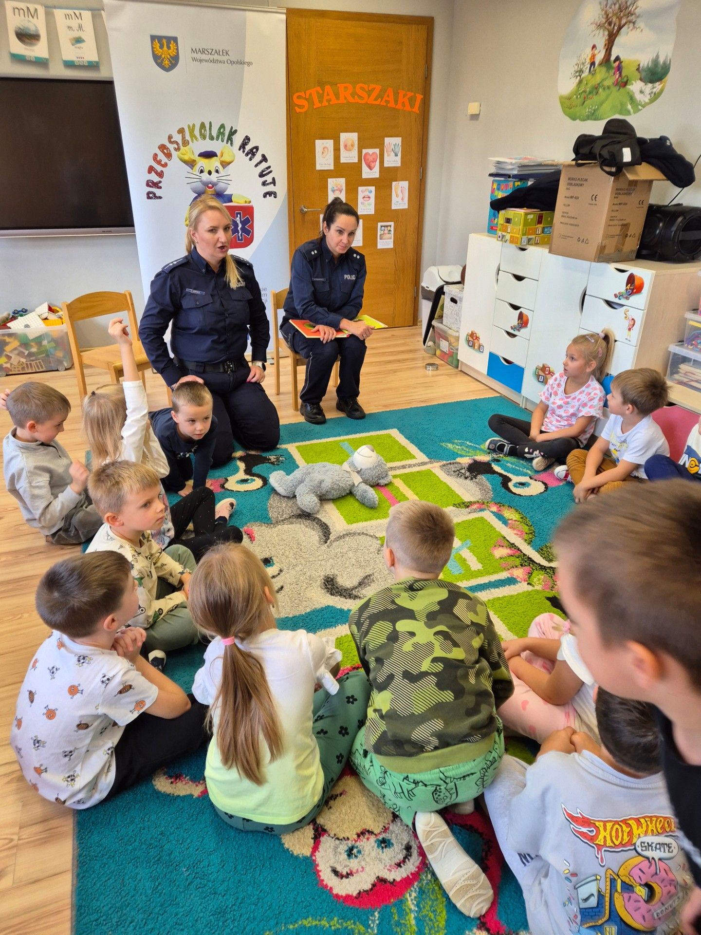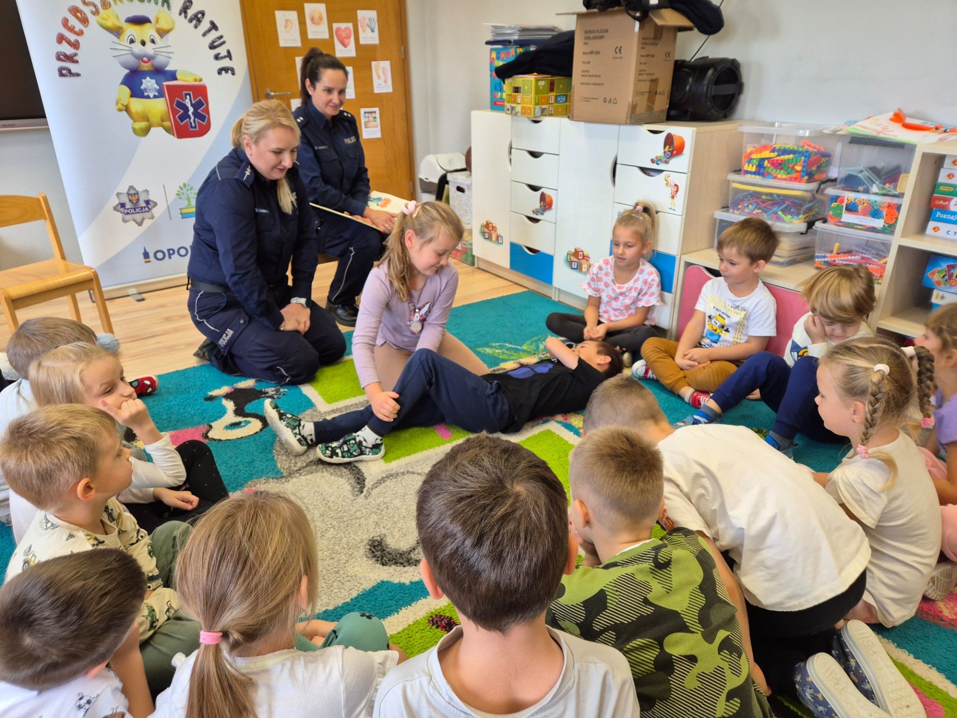 13.10.2025 roku w naszej placówce odbyło się wyjątkowe spotkanie, które miało na celu zwiększenie świadomości oraz umiejętności naszych najmłodszych w zakresie bezpieczeństwa. Gościliśmy policjantki z Komendy Powiatowej Policji w Krapkowicach, które przeprowadziły z dziećmi interesujące zajęcia. Podczas tego spotkania dzieci miały okazję przyswoić zasady bezpieczeństwa, które są kluczowe w codziennym życiu. Szczególną uwagą cieszyła się nauka utrwalenia numeru alarmowego, co jest umiejętnością nieocenioną w sytuacjach kryzysowych. Dzieci uczyły się także podstaw udzielania pierwszej pomocy, które są niezwykle wartościowym elementem w procesie edukacyjnym i świadomościowym. Na zakończenie policjantki wręczyły każdemu dziecku nagrodę w postaci medalu oraz woreczka odblaskowego.