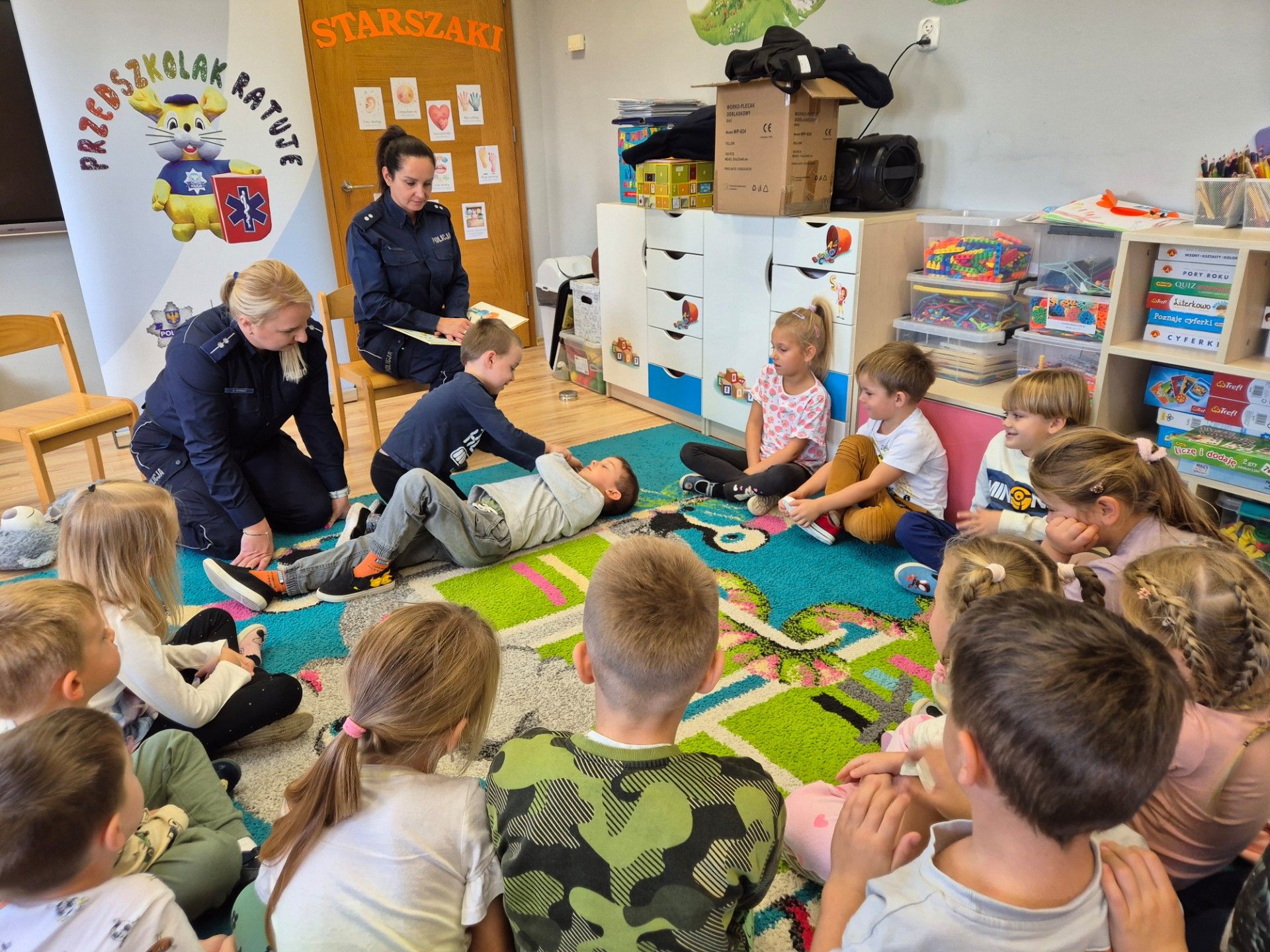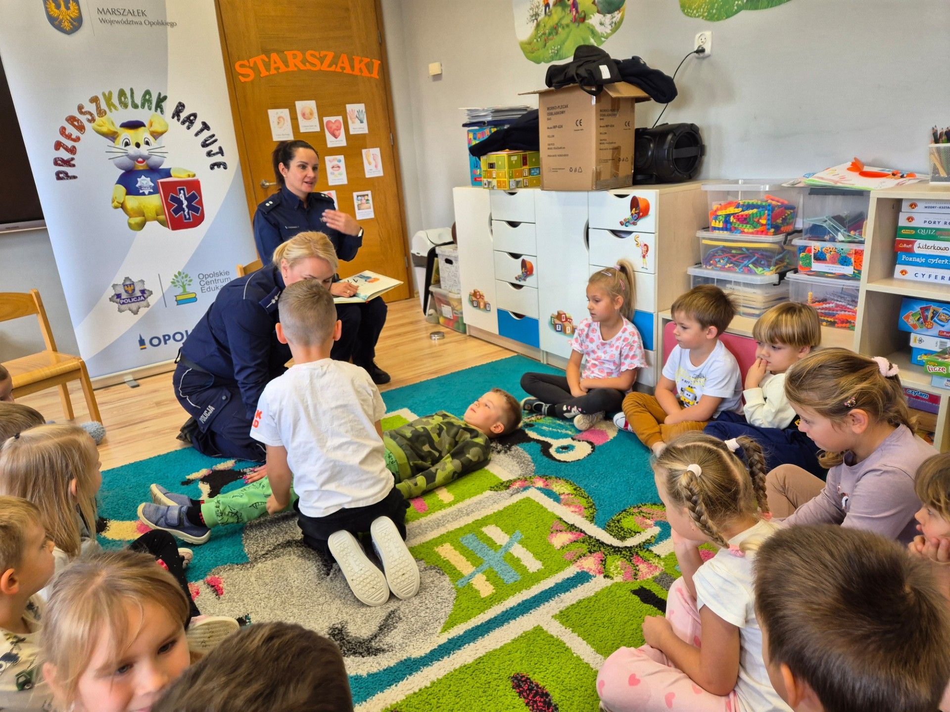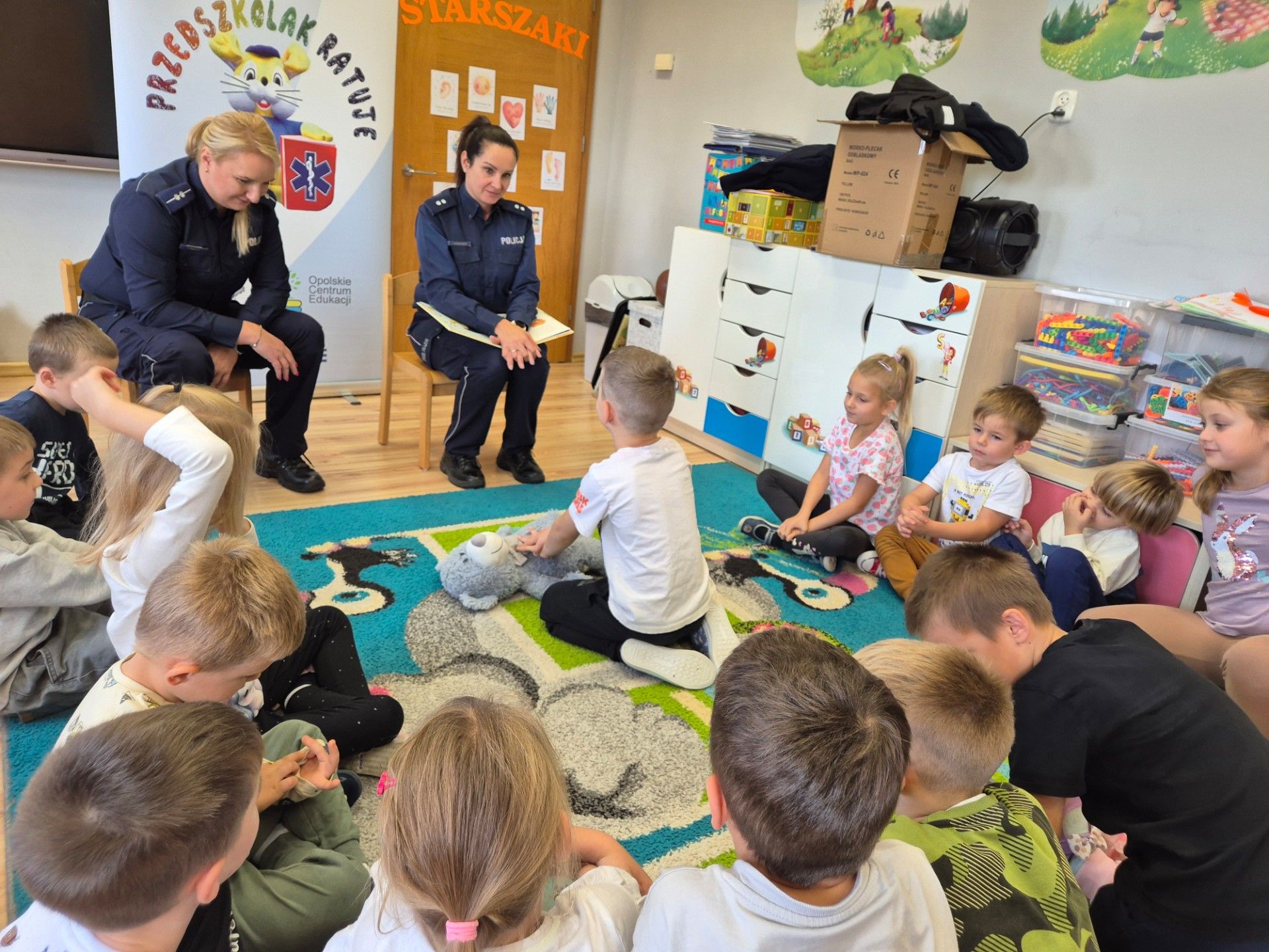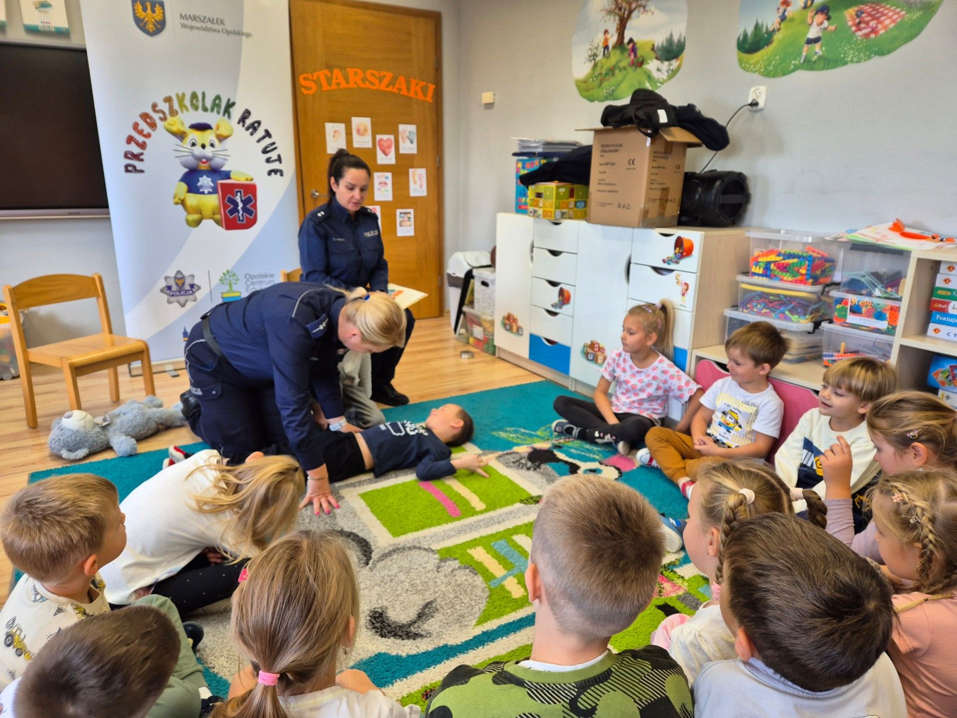 13.10.2025 roku w naszej placówce odbyło się wyjątkowe spotkanie, które miało na celu zwiększenie świadomości oraz umiejętności naszych najmłodszych w zakresie bezpieczeństwa. Gościliśmy policjantki z Komendy Powiatowej Policji w Krapkowicach, które przeprowadziły z dziećmi interesujące zajęcia. Podczas tego spotkania dzieci miały okazję przyswoić zasady bezpieczeństwa, które są kluczowe w codziennym życiu. Szczególną uwagą cieszyła się nauka utrwalenia numeru alarmowego, co jest umiejętnością nieocenioną w sytuacjach kryzysowych. Dzieci uczyły się także podstaw udzielania pierwszej pomocy, które są niezwykle wartościowym elementem w procesie edukacyjnym i świadomościowym. Na zakończenie policjantki wręczyły każdemu dziecku nagrodę w postaci medalu oraz woreczka odblaskowego.